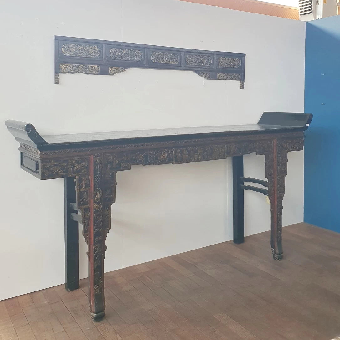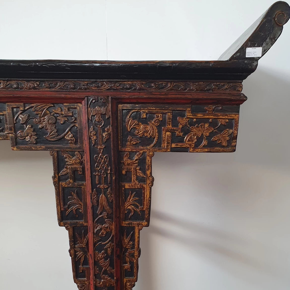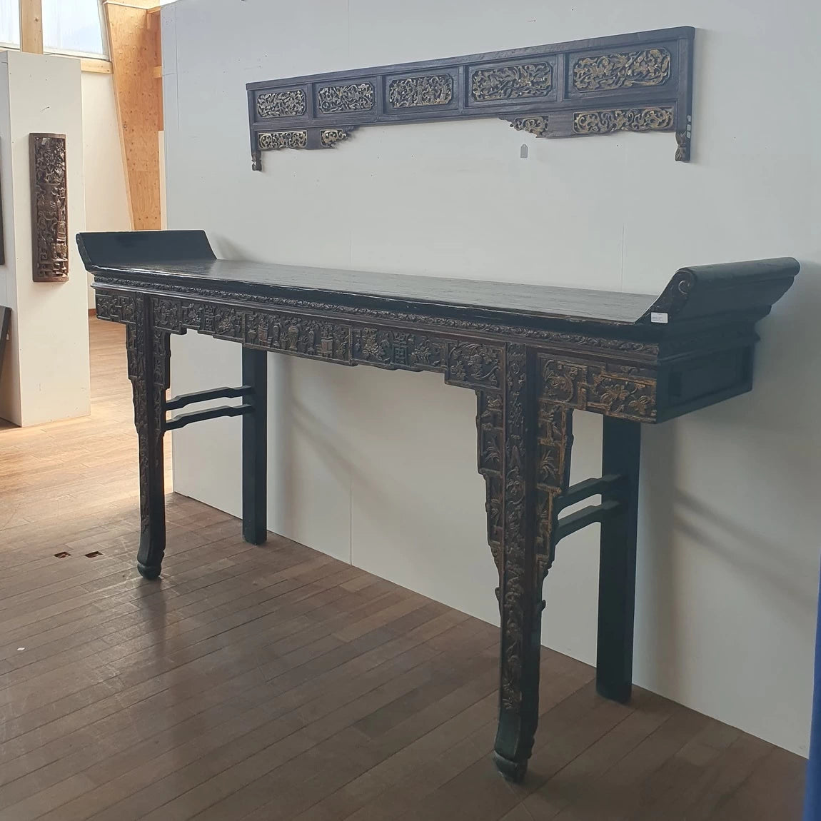 Majestueuse et chargée d’histoire, cette console de temple en orme sculpté est une pièce exceptionnelle du mobilier traditionnel chinois. Provenant de la province du Shaanxi, elle date de la fin du XIXᵉ siècle et se distingue par ses sculptures profondes et symboliques, ses retours latéraux courbés et sa grande envergure. Un meuble rare, à la présence unique, idéal pour un hall, une galerie ou un décor d'exception.